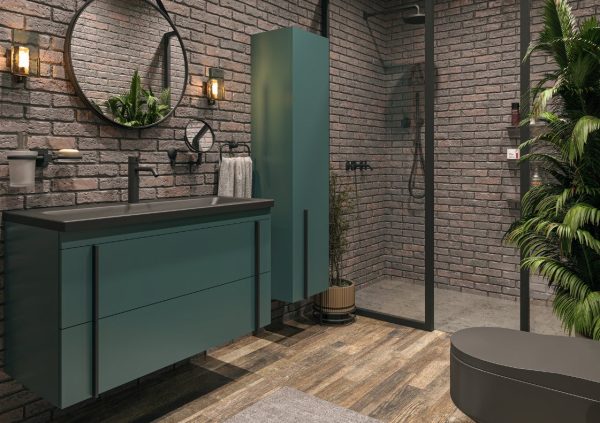 Ağır tarzı, temiz kesik çizgileri, altın rengi metal aksesuarları, lake boya renk tonları ile ağır ve zengin bir banyo modeli sunuyor.